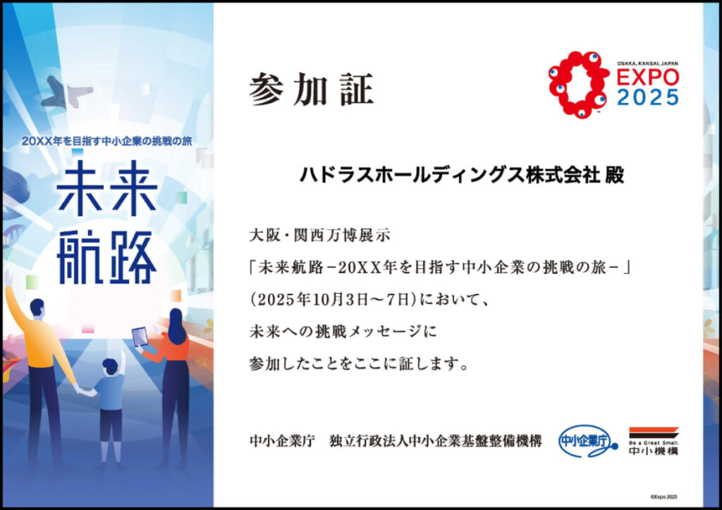 ハドラスホールディングス株式会社(本社:東京都中央区、代表:山本英明、以下「ハドラス」)は、2025年10月に大阪・関西万博内で開催された、独立行政法人中小企業基盤整備機構による体験型展示「未来航路‑20XX年を目指す中小企業の挑戦の旅」において、“未来への挑戦メッセージ”を発信する企業のひとつとして参加したことをご報告いたします。